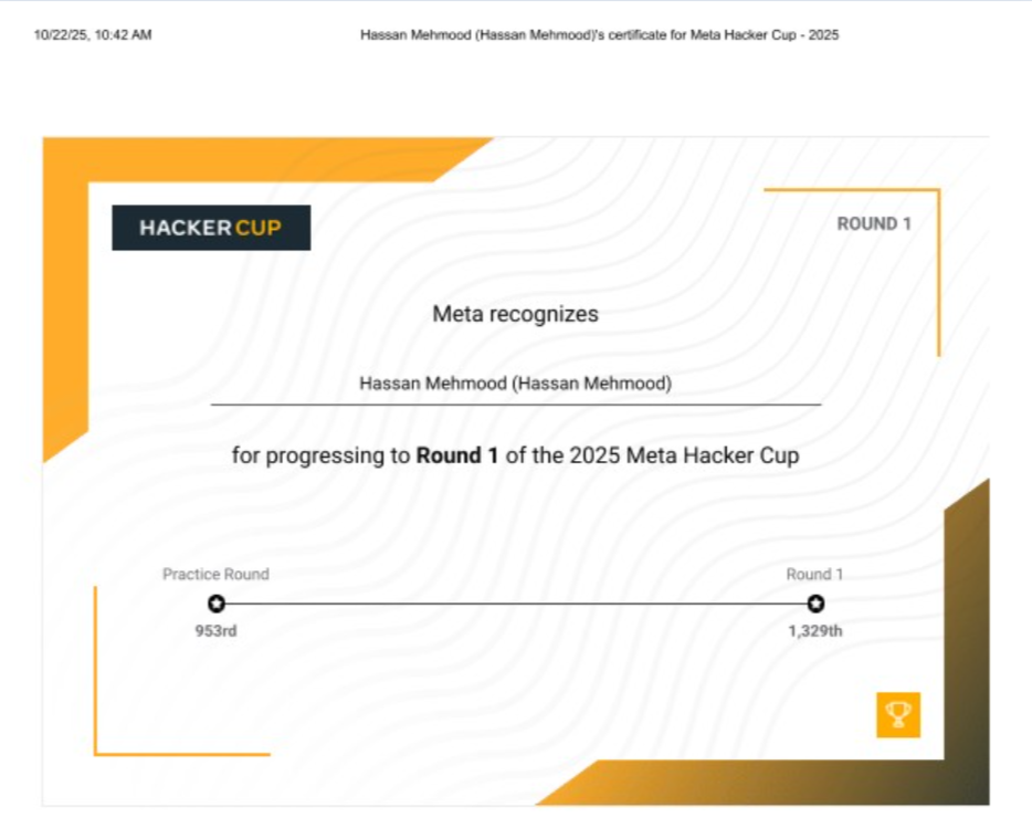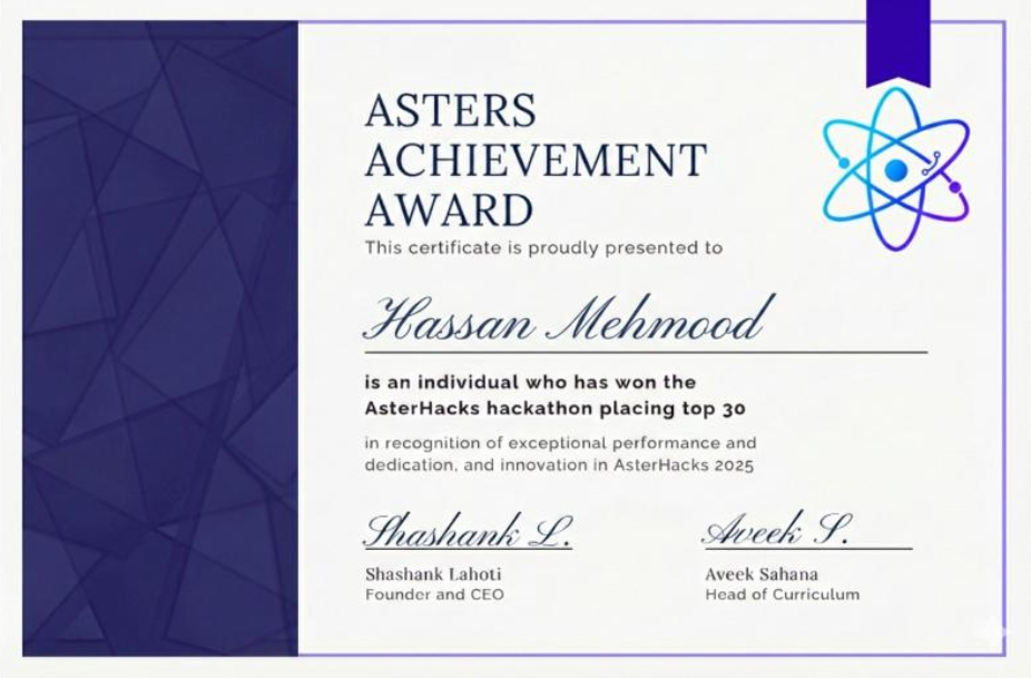 "I had the pleasure of collaborating with Hassan on our Network Resilience API project during a high-pressure hackathon. Hassan was not only instrumental in developing the frontend components that transformed complex data into an intuitive, user-friendly dashboard. His deep technical expertise allowed him to seamlessly integrate interactive visualizations, real-time telemetry streaming, and advanced data processing features into a cohesive system that exceeded our expectations. His ability to quickly grasp and implement new technologies, such as Chart.js and Cytoscape.js, combined with his diligent work on optimizing API calls and ensuring responsive design, truly set him apart."