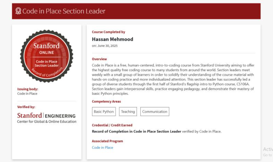 Mentoring students globally in Python programming through Stanford's prestigious Code in Place initiative